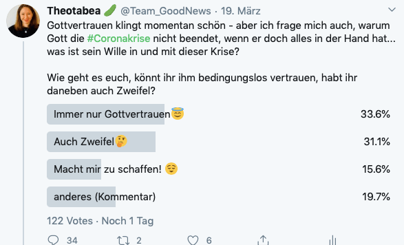 Ich habe euch gefragt, ob ihr auch Zweifel habt. Ob neben dem Gottvertrauen, das momentan so hilfreich ist, nicht auch Zweifel bestehen …